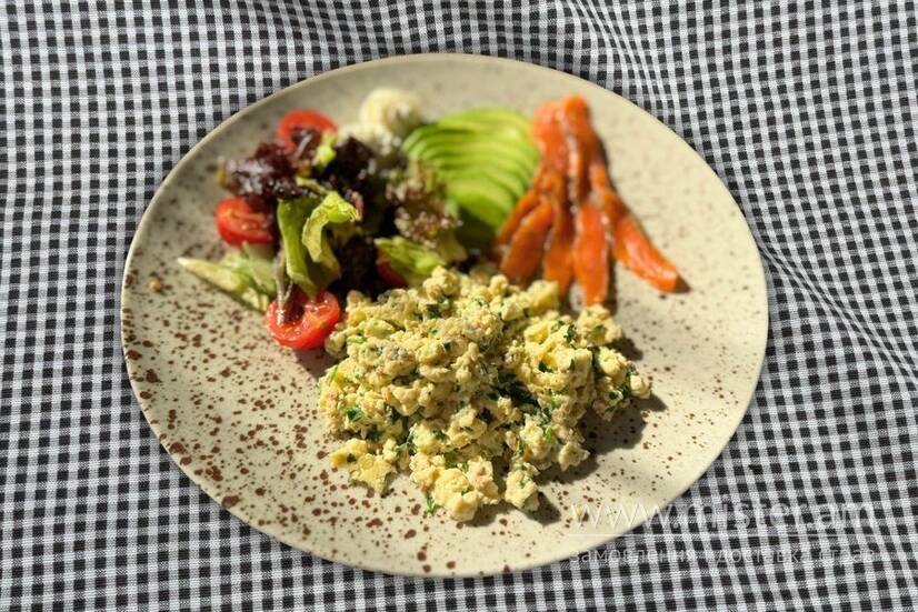 Яйця перебиті з зеленню та вершками, авокадо, лосось слабосолений, мікс салату з апельсиновим дресінгом, помідор Чері, крем сир.