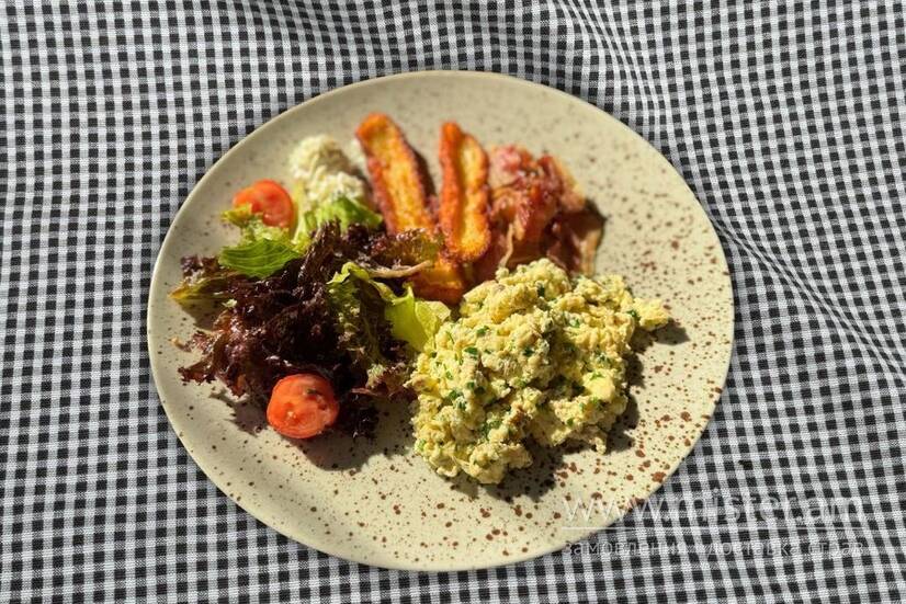 Яйця перебиті з зеленню та вершками, бекон, сир Халумі, мікс салату з апельсиновим дресінгом, помідор Чері, крем-сир.