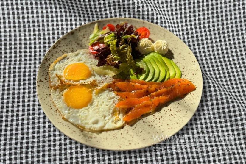 Яйця, авокадо, лосось слабосолений, мікс салату з апельсиновим дресінгом, помідор чері, крем-сир.