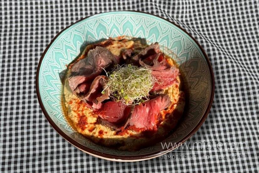 Класичний хумус з ростбіфом та соусом чимічурі з додаванням кінзи.