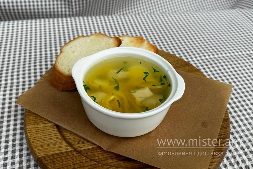 Наваристий курячий бульйон з домашньою локшиною і яйцем.