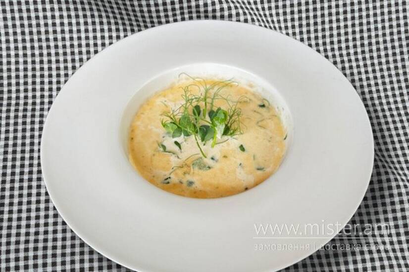 Суп вершковий з лососем та креветкою