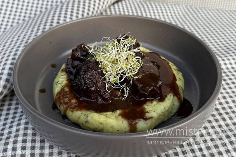 Телячи щічки томлені в червоному вині, меді, томатах та вишневому соусі, подається на подушці з пюре та зеленню.
