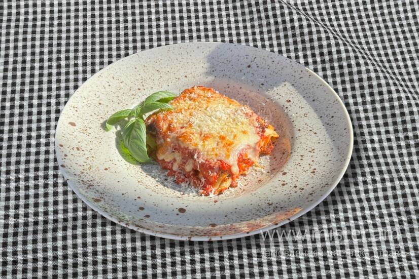 Листи тіста, соус Болоньєзе, соус Бешамель, соус пелаті, моцарела, пармезан.