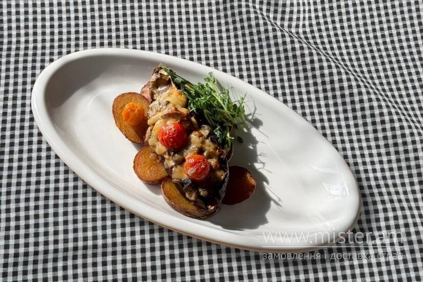 Баклажан запечений з грибами, томатами чері та медово-гічичнии соусом, подається з картоплею.
