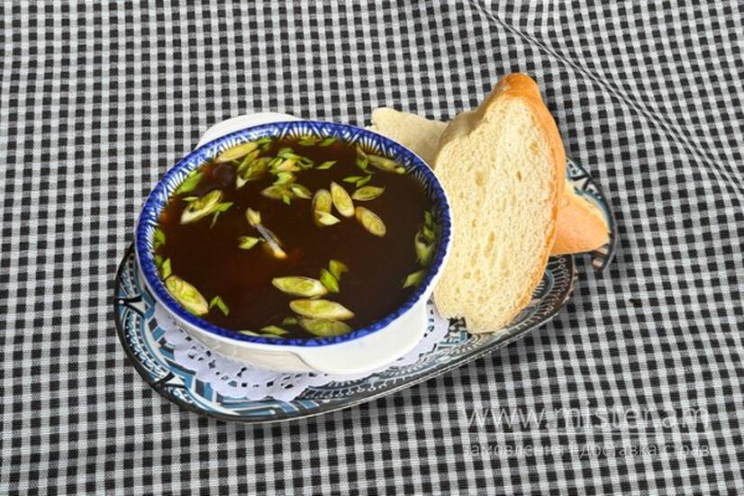Бульйон з додаванням місо пасти, соєвого соусу та олія кунжутної, гриби печериці, сир Тофу та зелена цибуля.