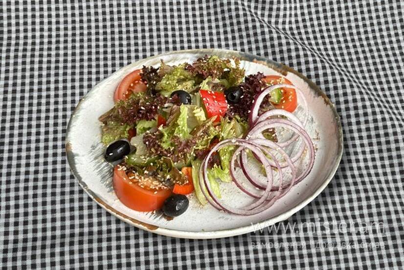 Перець солодкий, огірок, помідор, мікс салату, цибуля синя, маслини, кунжут, лимонна заправка.