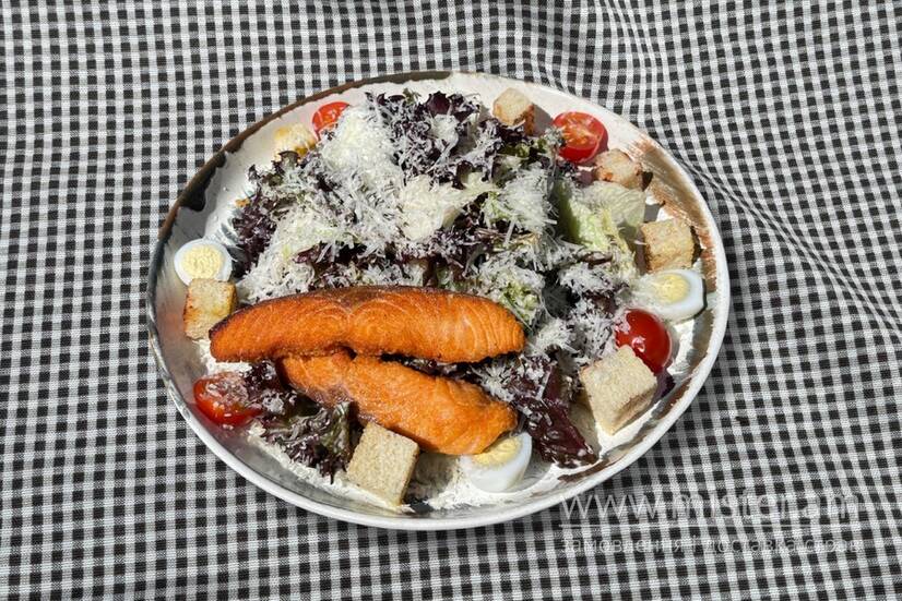 Салат з лососем, з листям салату з сиром пармезан і з насиченим соусом Цезар.