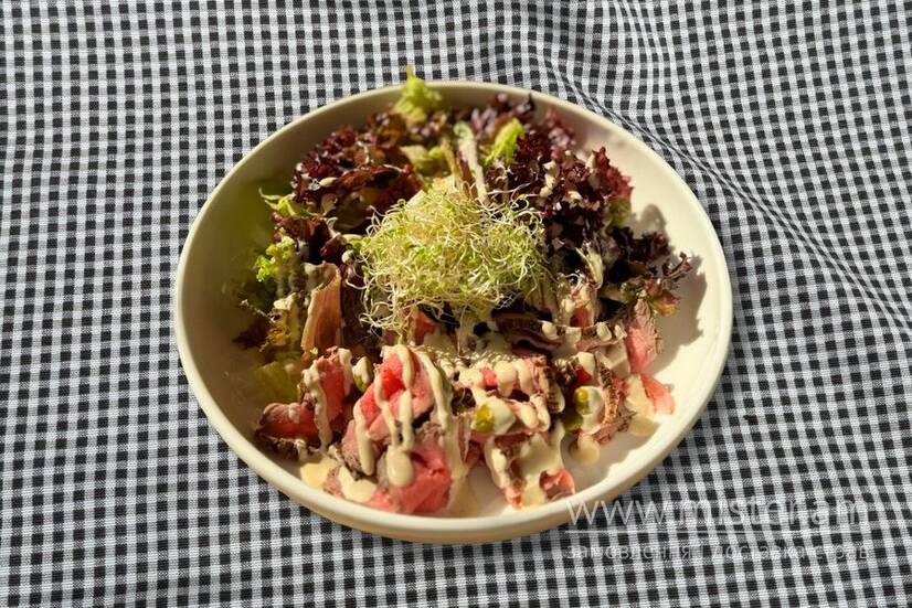 Мікс салату, ростбіф, томати в’ялені, каперси, дресінг апельсиновий, майонез тунцьовий.