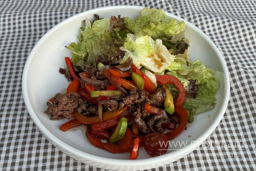 Мікс салату, солодкий перець, цибуля синя, помідор чері, рвана телятина, кабачок, каперси, заправка вінегрет.