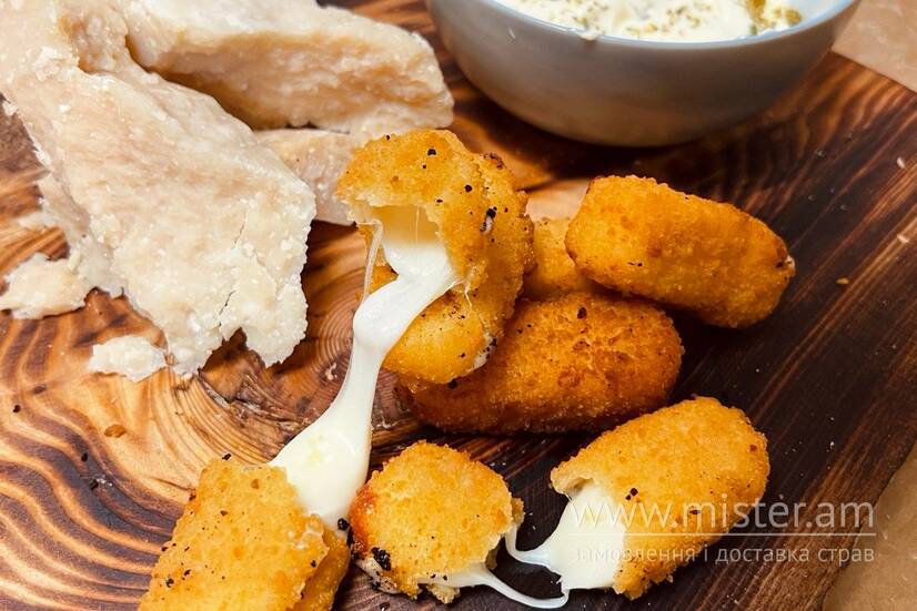 Сирочок моцарела смажений у фритюрі. Чи взагалі законно так тягнутися?! P.S. Дуже гармонує з нашим фірмовим білим соусом або старої класикою у вигляді томатного соусу.
