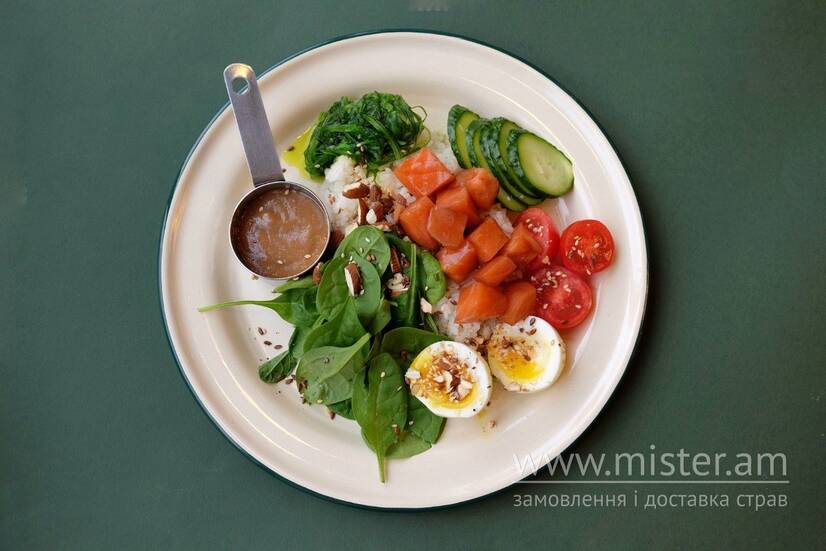 Рис, огірок, яйце, шпинат, черрі, соус горіховий, мікс насіння, кешю, зелена цибуля.