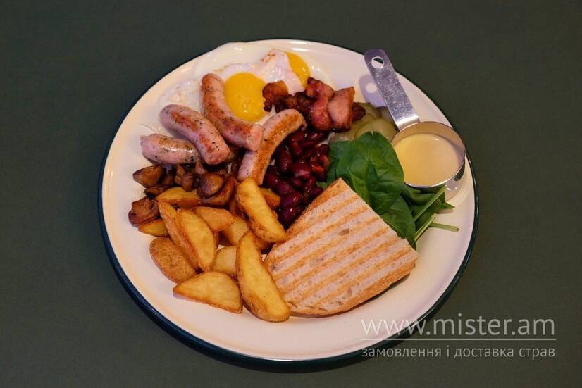 Глазунья з двох яєць, свино-яловичі ковбаски підсмажені легенько на сковородочці, бекон, картопля, печериці, шпинат і тушкована в томатному соусі квасоля, медовий хліб на заквасці та сирний соус.