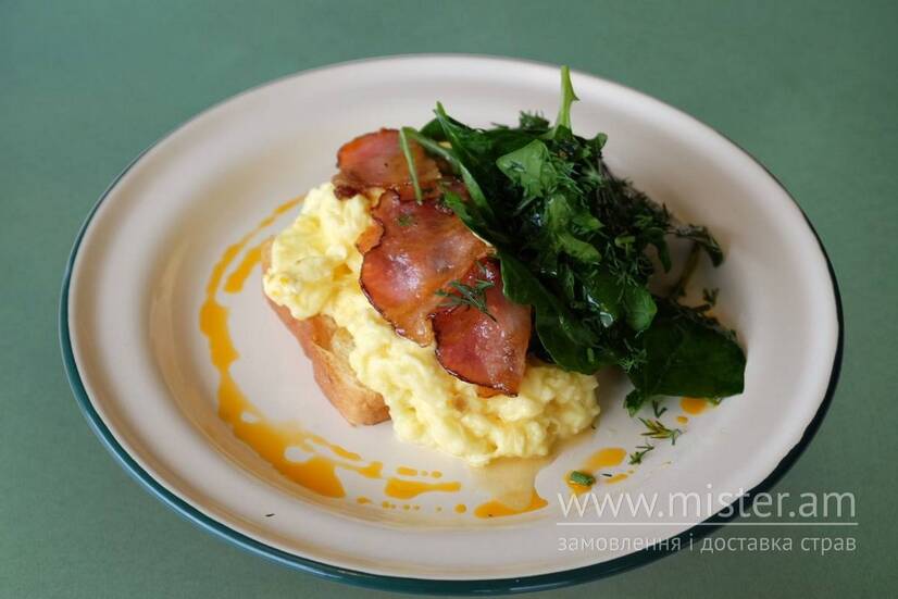 Пухкий бріош, скрембл з 3-х яєць, щось незвичайне-солодкий ароматний бекон, та соковитий салат з руколи та шпинату в соусі май чілі.