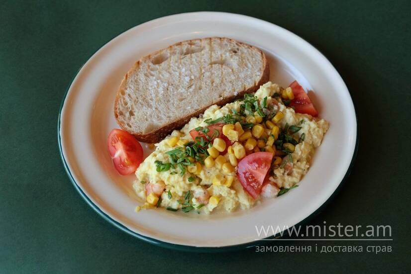 Ніжний скрембл із соковитими креветками, кукурудзою та зеленню, подається з медовим хлібом і стиглими томатами чері.