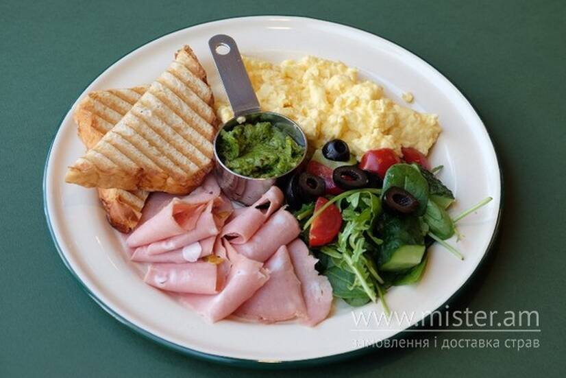 Сирний скрембл, мортадела, мигдалева паста, маслини, салат з руколи томатів огірків в соусі сорго, підсмажений медовий хліб на заквасці.
