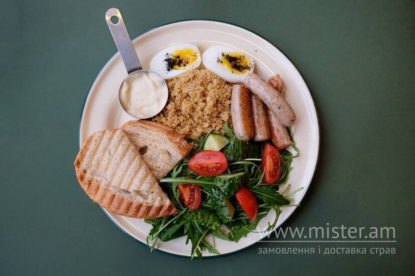 Кус-кус з овочами, мікс салату (рукола, шпинат), чері, огірок, заправлений соусом сорго, п`ятихвилинне яйце, медовий хліб. На вибір можна обрати ковбаски фірмові, куряче філе су-від, тунець консервований. Подаємо з соусом цезар.