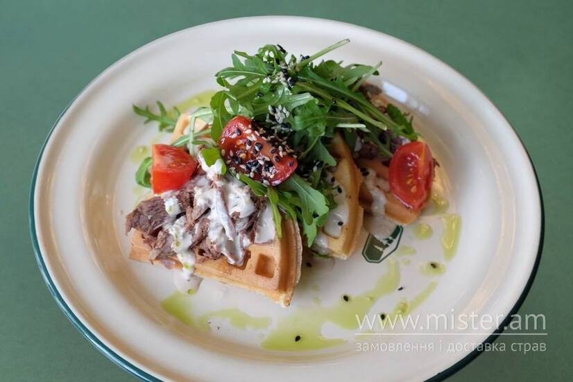 Вафлі з рваною телятиною, соусом вітелло тонато, томатами чері та руколою.