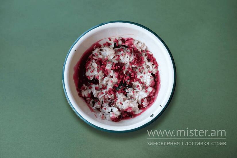 Плющену вівсянку готуємо з вершками, крем сиром, сухофруктами (журавлина, курага, чорнослив), та вишневим соусом, декорується сублімованою малиною та волошками.
