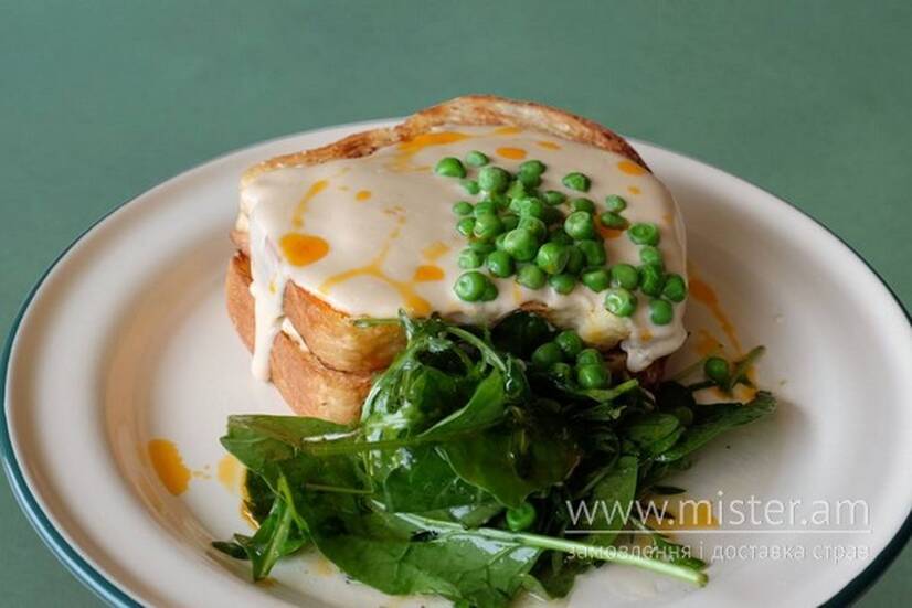 Запашний хлібчик бріош, стиглий авокадо та куряче філе сувід, заправлений соусом солодкий май чілі, крок поливається соусом морне, та салатик зі шпинату і рукколи.