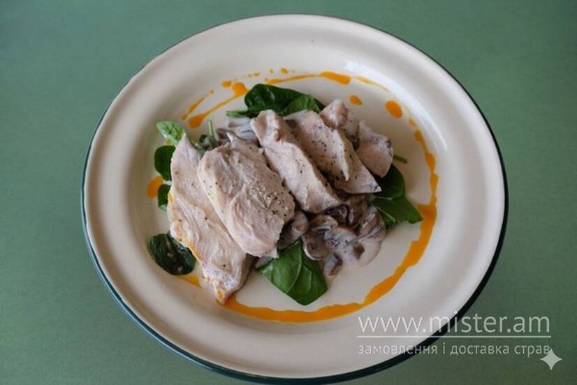 Ніжна індичка сувід, зі смаженими шампінйонами, оксамитові вершки, та соковитий шпинат, поливаємо запашною червоною олією.