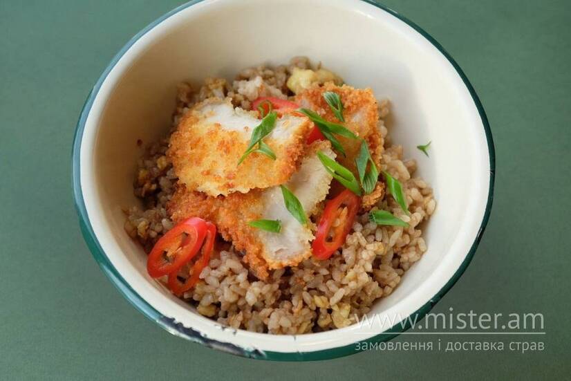 Смажений рис з яйцем і ніжною куркою, приготованою методом сувід, ароматизований кунжутною олією та соєвим соусом, доповнений пікантним перцем чілі і зеленою цибулею.