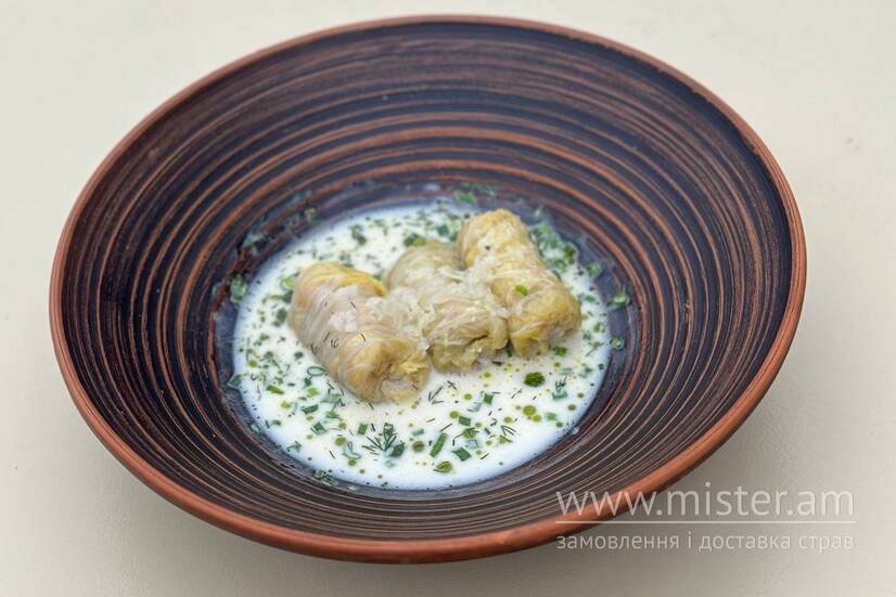 Класичні голубці, в ніжному соусі на основі вершків з обсмаженою цибулькою та білим вином. Подаємо з зеленим маслом та запашною зеленню.