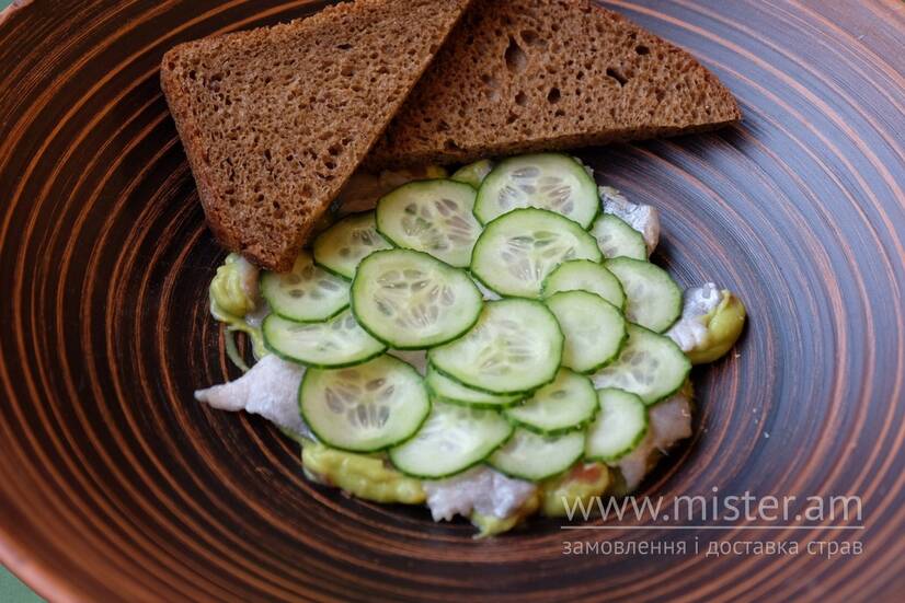Ніжне філе оселедця на подушкі з гуакамоле, вкрите слайдами свіжого запашного огірка, подається з ароматним чорним хлібом.