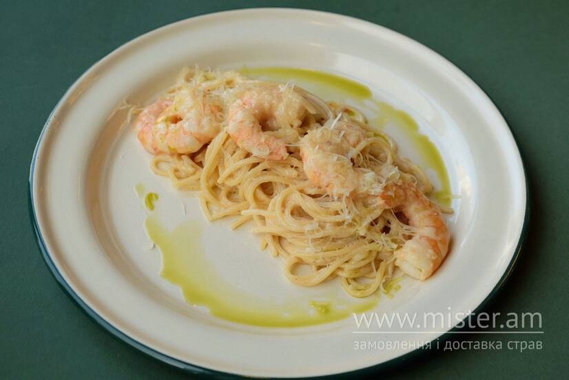 Вершки, пармезан, часник, соус на основі жовтків та вершків, креветки.
