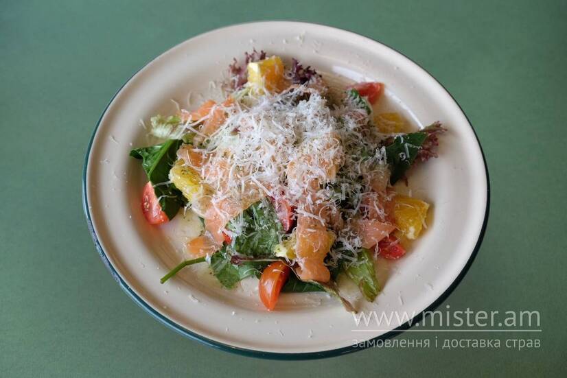Соковитий мікс салат, слабосолений ніжний лосось у поєднанні з апельсином, лаймовою заправкою з м`ятою, та щедро посипаний пармезаном.