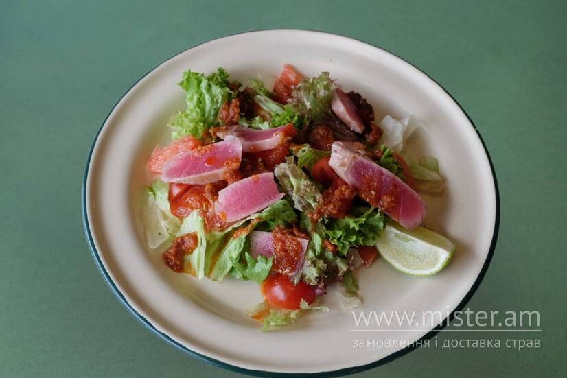 Соковитий мікс салату, стиглі чері, підсмажений тунець в поєднанні з грейпфрутом та соусом з в`ялених томатів.