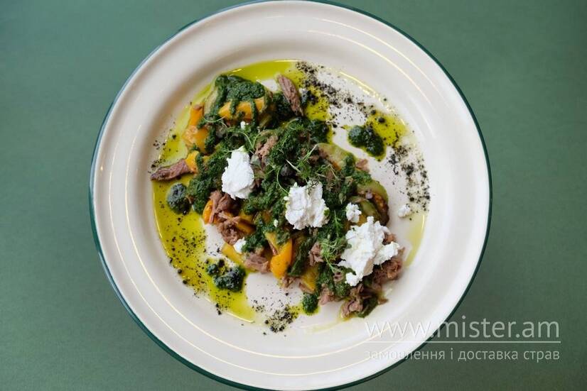 Салат з рваною телятиною, запеченими овочами (цукіні, болгарський перець), сиром фета, грибними цукатами з пряним соусом Чімічурі та зеленим маслом, декорується землею з маслин.