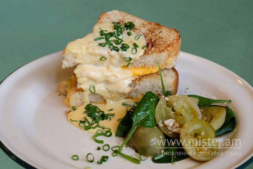 Запашний бріош з тягучим чедером та дорблю, политий оксамитовим сирним соусом, для справжніх поціновувачів сирів. Подаємо з салатом зі шпинату та власноруч квашених зелених томатів.