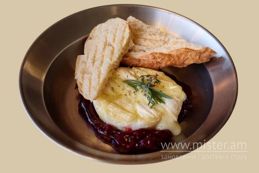 Ніжний сир камамбер, запечений до легкої тягучості й вершкової м’якості. Подається з ароматним медовим хлібом та яскравим вишневим джемом, що додає страві солодко-кислого акценту. Ідеальна тепла закуска для справжніх гурманів.