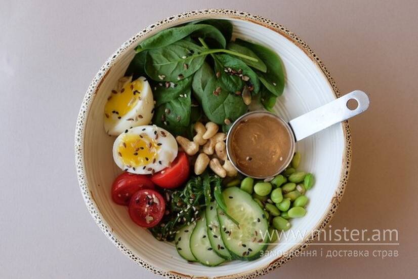 Рис, огірок, яйце5хв, шпинат, черрі, соус горіховий, мікс насіння, кеш`ю, боби соєві, зелена цибуля.