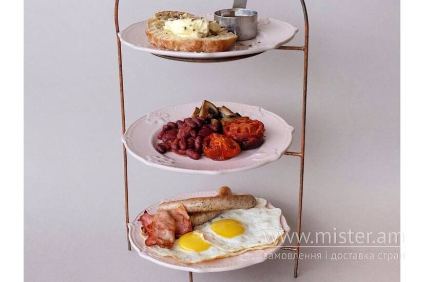 Заквасний хліб, масло солоне, з насінням / печений томат, смажені гриби, квасоля в томатному соусі, два яйця, ковбаски, смажений бекон.