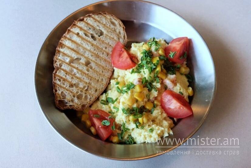 Ніжний скрембл із соковитими креветками, кукурудзою та зеленню, подається з медовим хлібом і стиглими томатами чері.