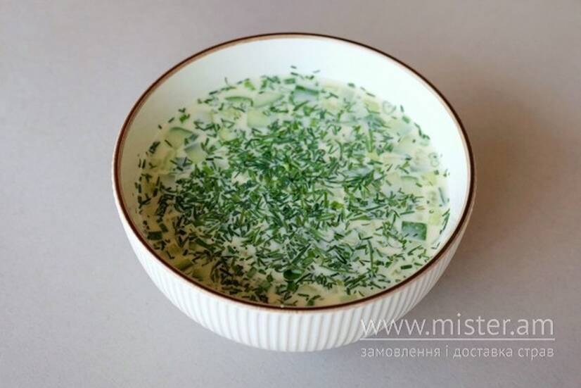 Окрошка з ніжним лососем, відварною картоплею, свіжим огірком та яйцем на основі легкої юшки з грецького йогурту. Освіжаюча страва з делікатним смаком.