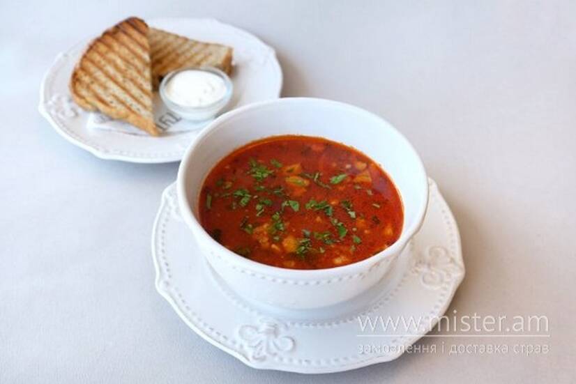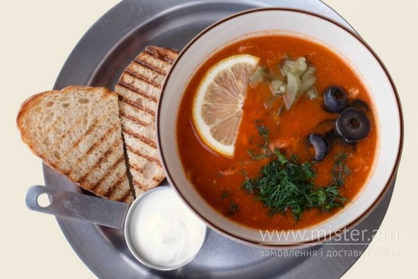 Солянка на основі телятини, ковбасок, курячого філе. Подається з маслинами, лимоном та хлібом.