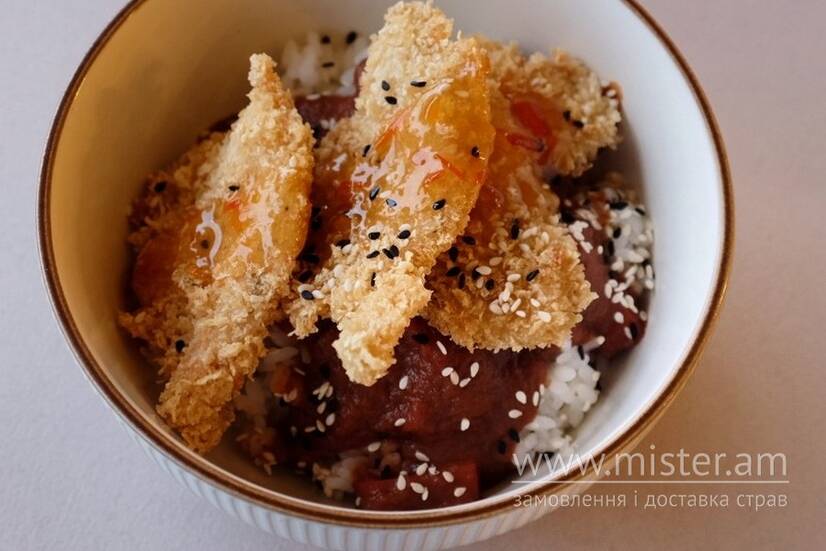 Рис, куряче філе, карі цибуля з морквою, зелена цибуля, кунжут.