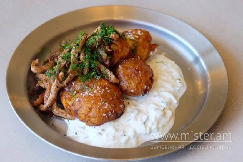 Картопля молода зі свининою та соусом дзадзикі