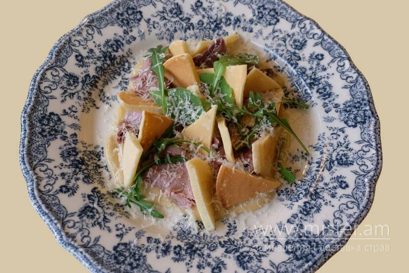 Тут зібралося все, що любиш: соковитий ростбіф, панкейки як хмаринки, соус айолі з каперсами та оливками, плюс руккола й пармезан — просто смакова феєрія!