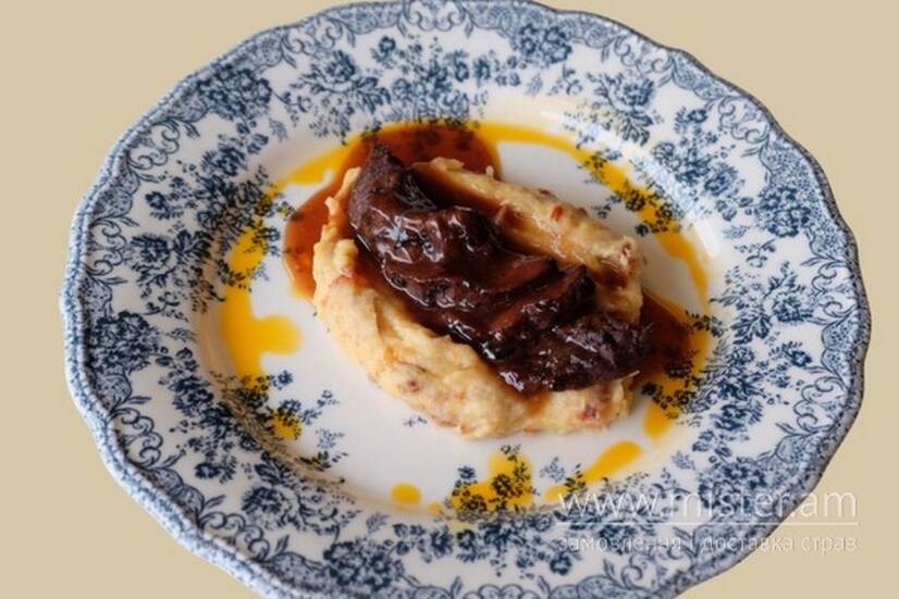 Ніжна тушкована телятина, запечена під ароматним медово-барбекю соусом, подається з кремовим картопляним пюре та в`яленими томатами.