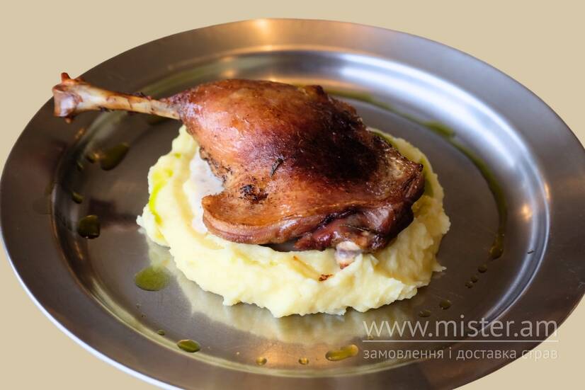 Качина ніжка су-від запечена з медом, з картопляним пюре та грибним соусом з трюфельною пастою