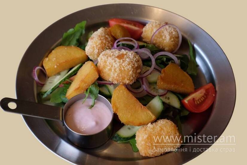 Свіжий мікс салатів у поєднанні з хрусткою смаженою картоплею та ніжним камамбером у паніровці. Додаємо мариновану синю цибулю, соковиті томати чері та огірок. Легкий пікантний соус алабама завершують страву та робить її насиченою і гармонійною.