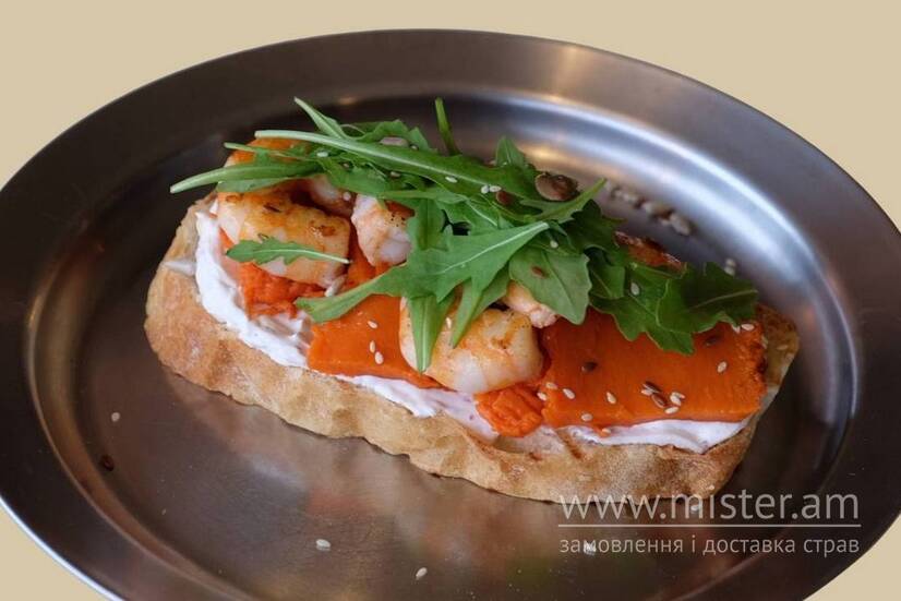 Ароматний медовий хліб, підсмажений до легкої хрумкості, подається з соковитою смаженою креветкою. Додаємо ніжний запечений гарбуз і свіжу руколу, що створює ідеальний баланс солодкого, солоного та пряного смаку.
