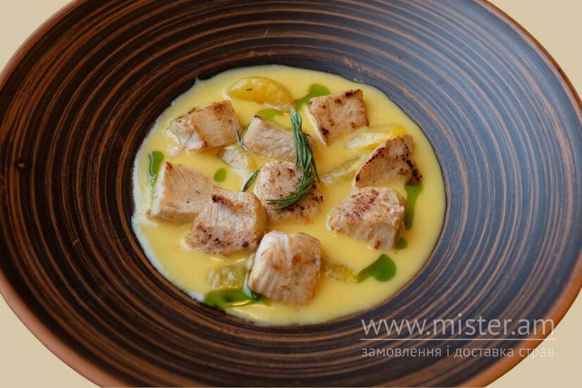 Обсмажене філе індички на вершково мандариновому пюре, з дольками мандарину.