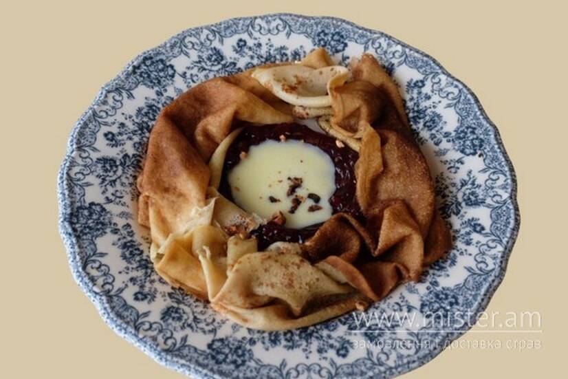 Рум`яні млинці з ароматним вишневим джемом та ніжим вершковим соусом.