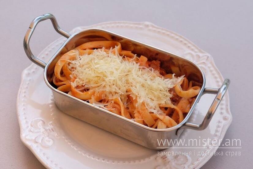 Паста з соусом Болоньєзе на основі фаршу (свинина+телятина) в соусі пілатті.