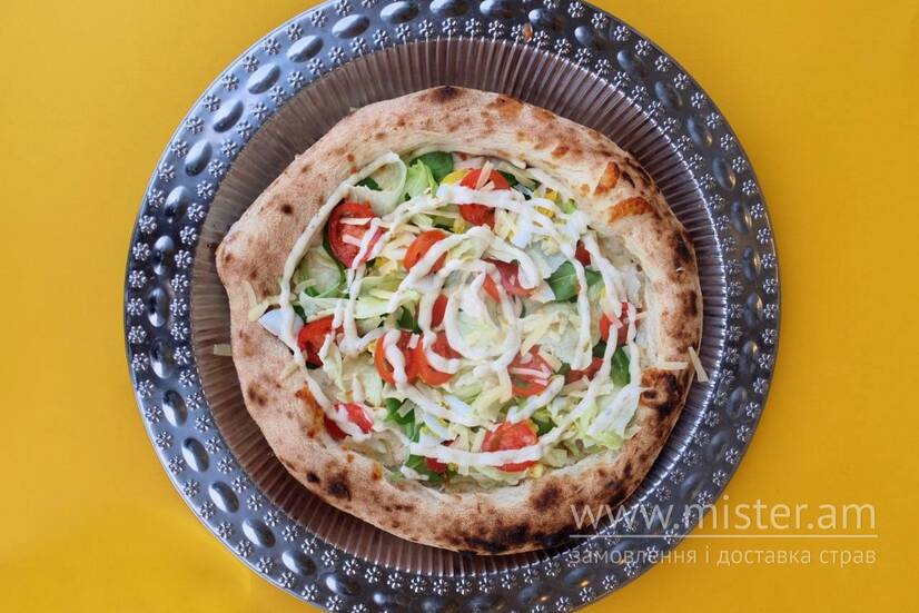 Вершкова основа, моцарела, соковите куряче філе, листя салату, чері, пекоріно та фірмовий соус Цезар — у кожному шматочку ніжність і свіжість.